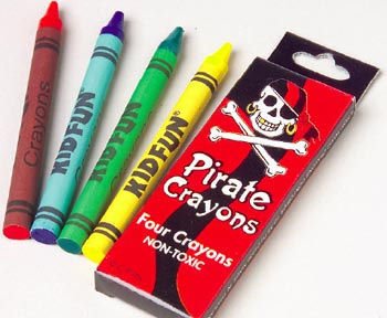 Add these pirate crayons to your party favor bags for added fun. Each box contains 4 crayons and is decorated with a pirate theme. Non-toxic. Assorted colors. Size 3-3/4 L. U.S. Toy Exclusive!"